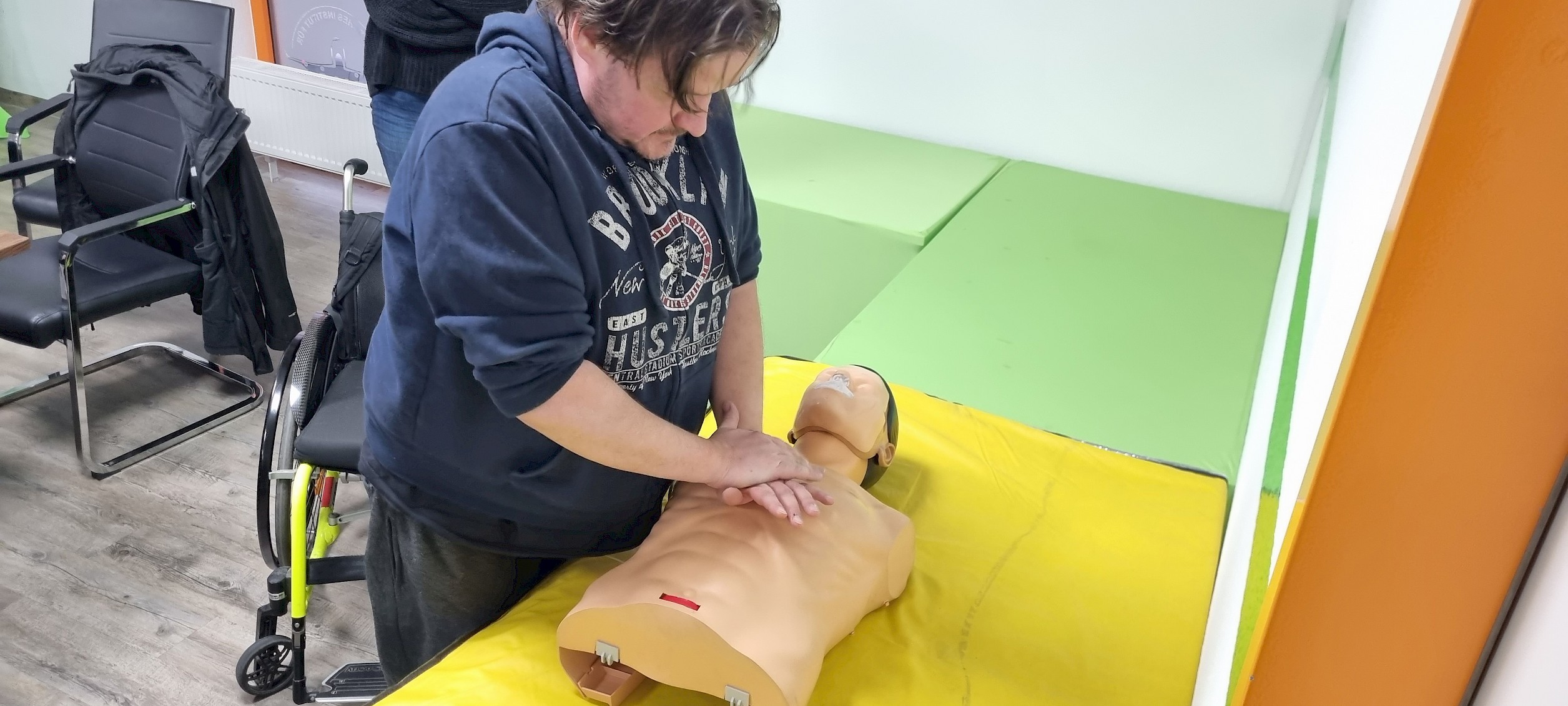 Mittlerweile ist Herr Reicherdt einige Zeit bei uns und hat schon einige Qualifikationen erreicht. Unter anderem hat er den Evakuierungs-, Brandschutz-, und Ersthelfer-Kurs erfolgreich abgeschlossen. Unser Dozent, Andreas Henning, erinnert sich „Als Herr Reicherdt zu dem Erstgespräch hier herkam, war ich grade mit meinem Kurs zu einer Übung auf unserem Gelände unterwegs. Ich sah ihn und fragte mich, ob er sich verfahren hatte, weil ein Rollstuhlfahrer in der Sicherheit absurd ist. Er hat mich - und uns alle - eines Besseren belehrt!“